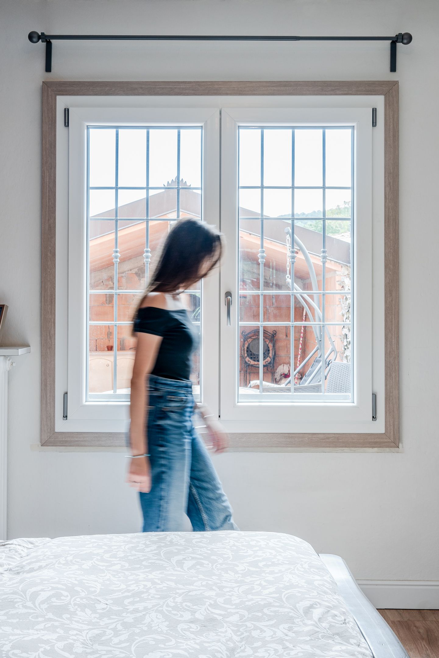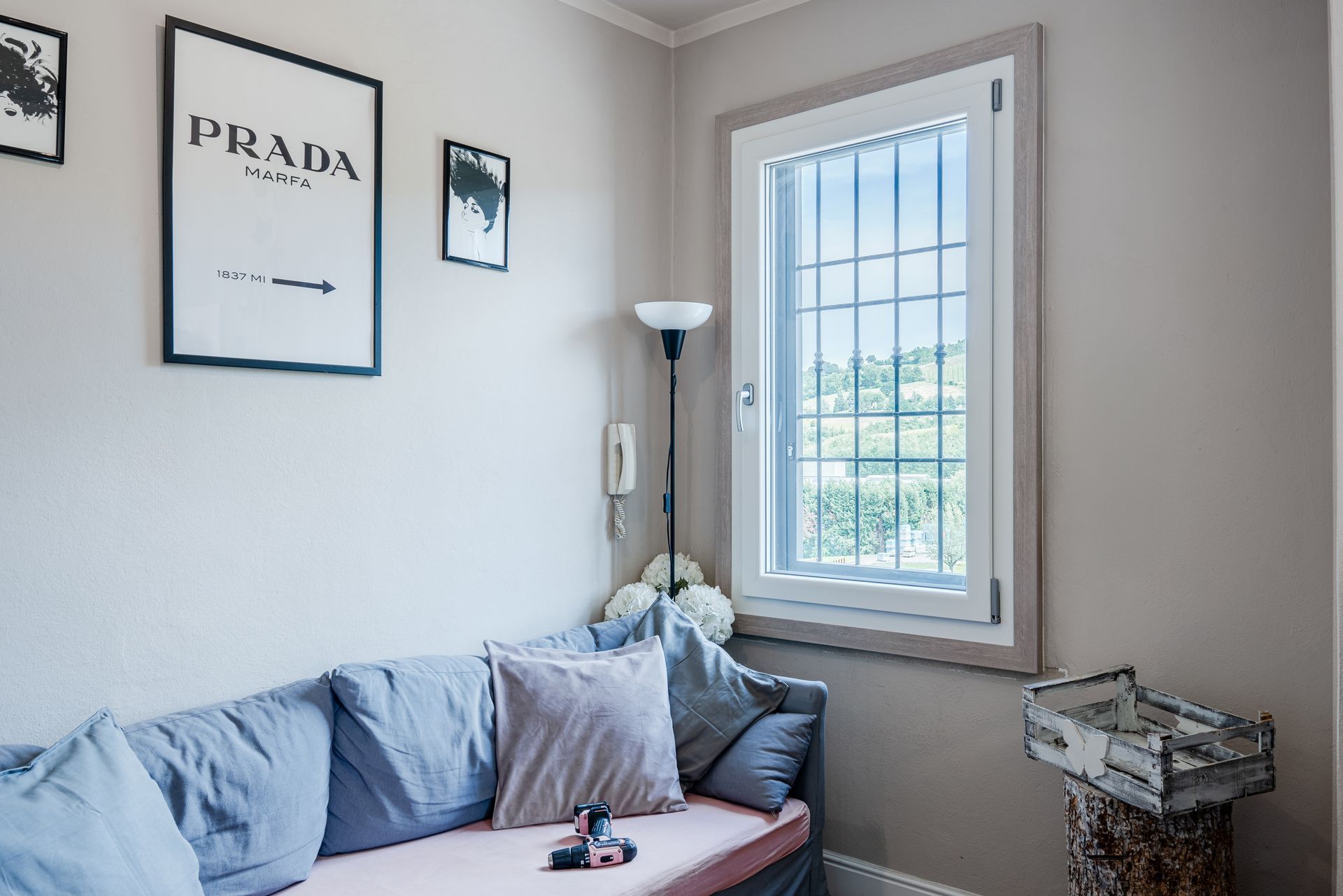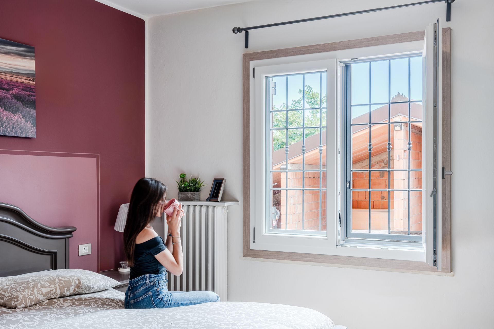 Per poter soddisfare le richieste della cliente, anche in questo caso, abbiamo consigliato, ai fini energetici, un serramento con doppio vetro a basso emissivo con canalina calda e tripla guarnizione; per quanto riguarda invece il design, per contenere i costi, abbiamo consigliato un serramento bianco standard abbinato però a coprifili interni in effetto shabby chic che rispecchiassero i gusti della ragazza.