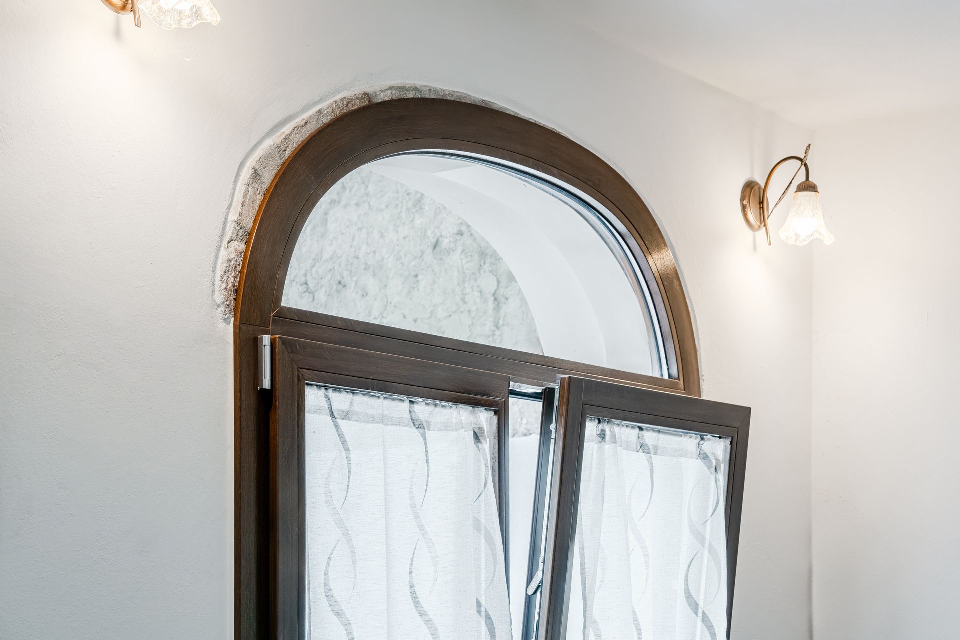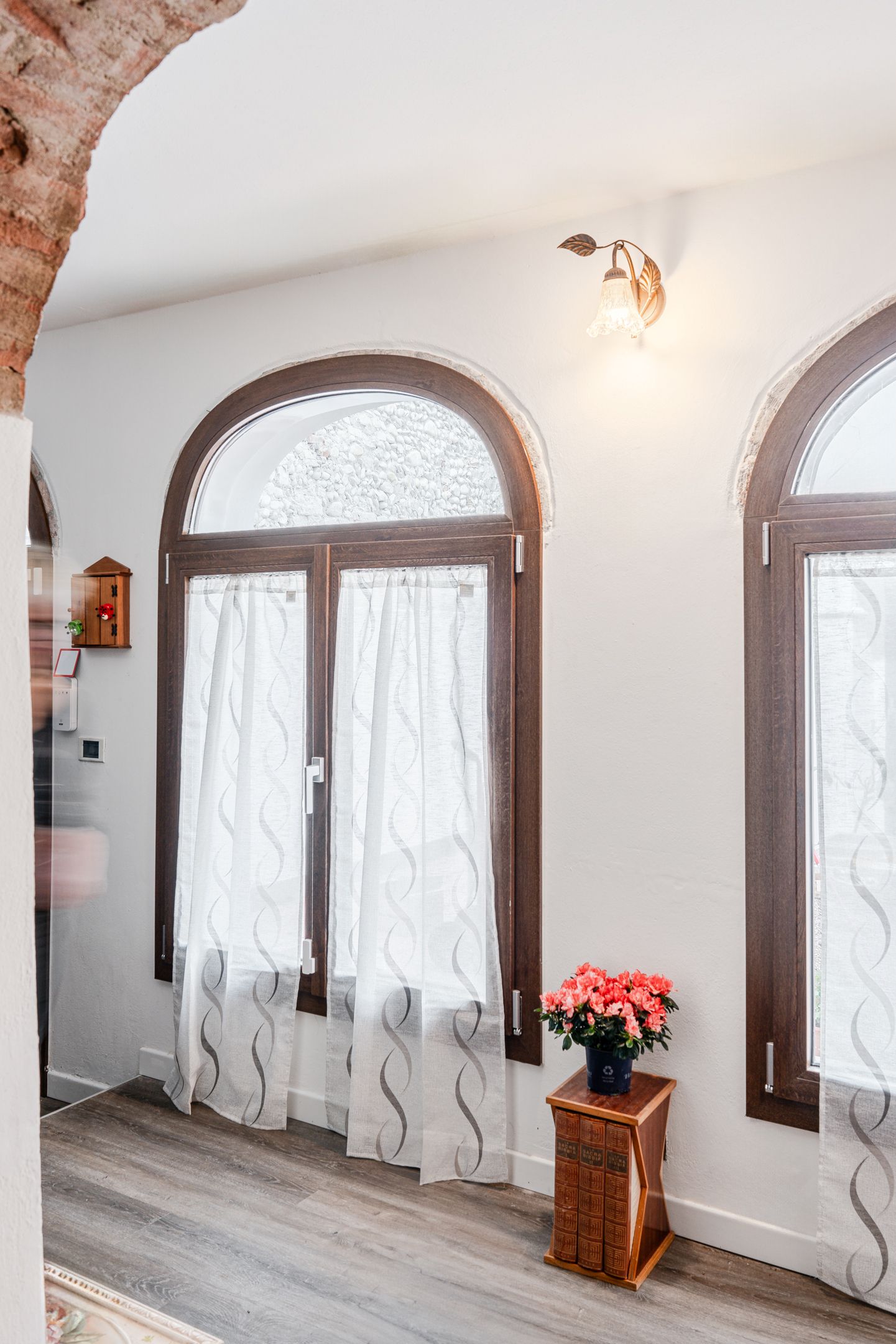 Durante la ristrutturazione dell’appartamento le è stata consigliata la sostituzione delle finestre per risolvere alcuni problemi di umidità ma trovare un fornitore in grado di replicare la particolare forma degli archi a sesto ribassato con serramenti moderni è risultato più difficile del previsto.